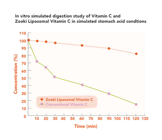 The result? 10x less Vitamin C destroyed when using Zooki Liposomes after an hour in your stomach.