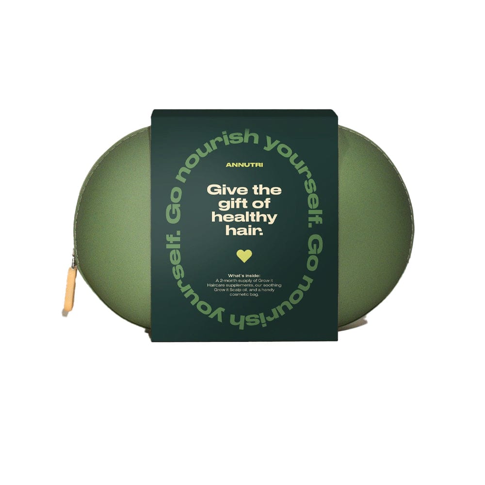 This collection fuses advanced nutrition with restorative scalp therapy. Inside awaits a two-month supply of the Grow It supplement alongside the Ayurveda-inspired Grow It Scalp Oil, all beautifully encased in a waterproof green cosmetic bag.Ā