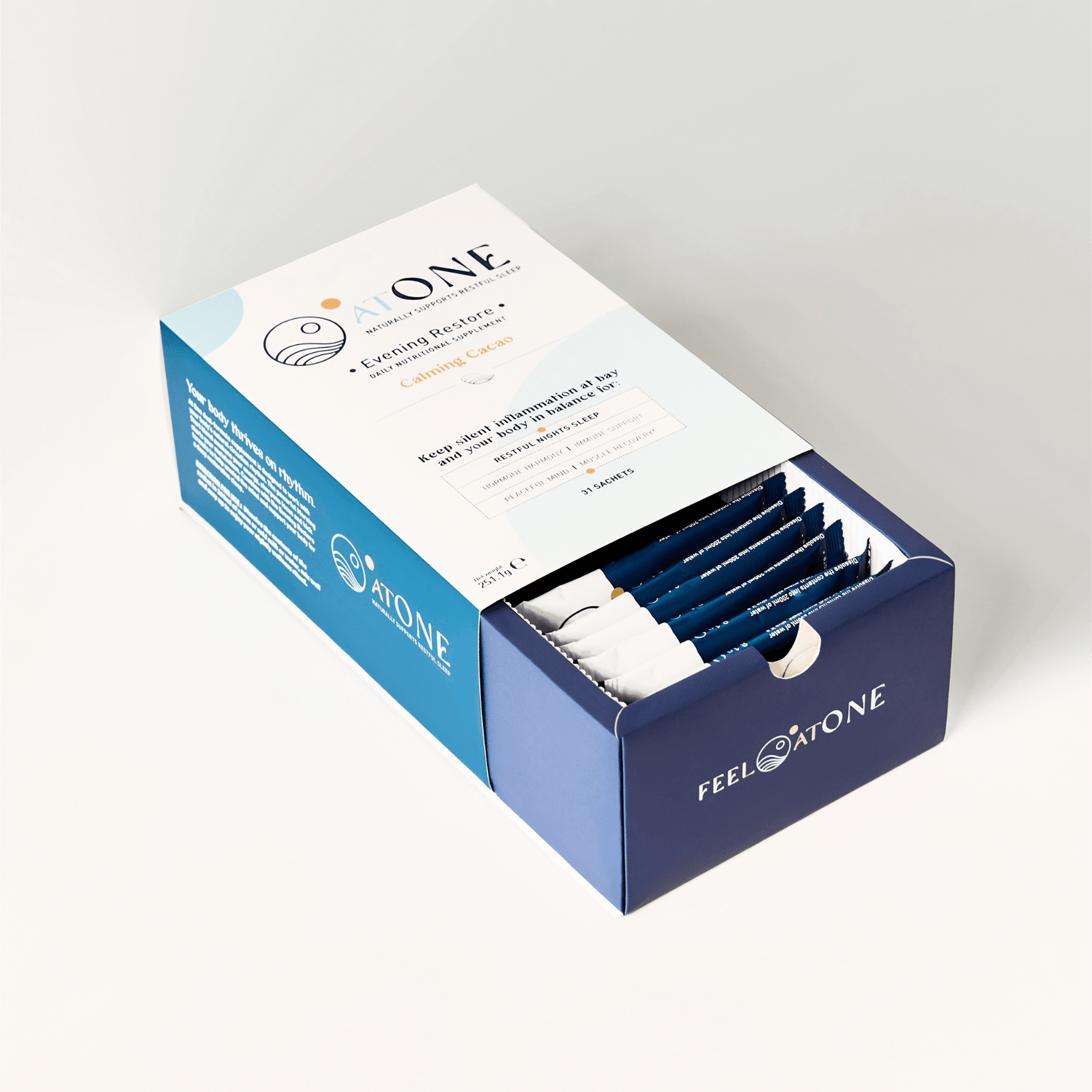 Evening Restore is a blend of 21 ingredients in an easy to use powder sachet with a natural calming cacao flavour. Each sachet helps calm the body and mind, promotes a deep restorative sleep, contributes to muscle recovery and repair, supports immune function, regulation of hormones, while balancing inflammation within the body as you sleep.