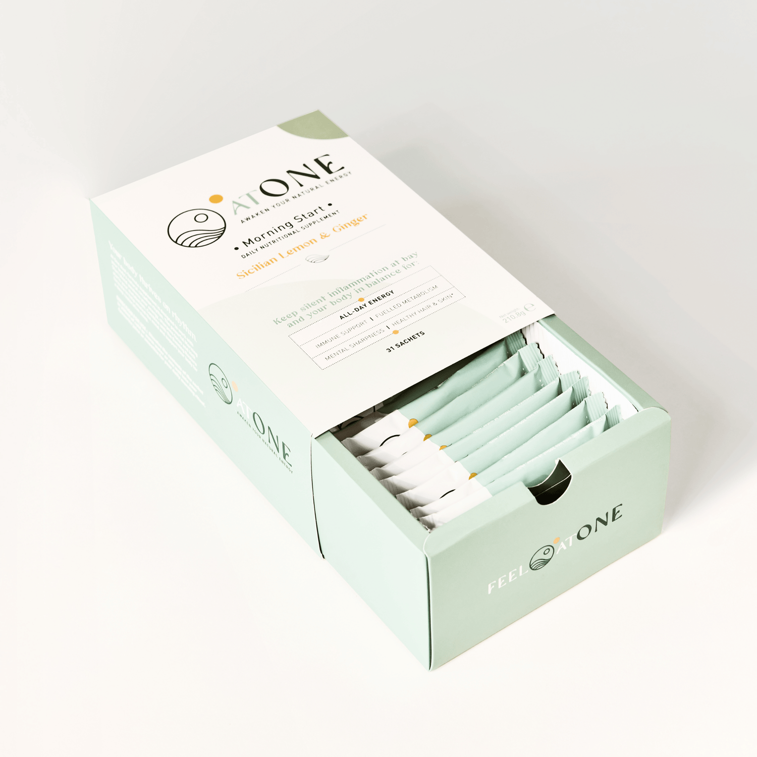 Morning Start is a blend of 29 ingredients in an easy to use powder sachet with a natural Sicilian lemon & ginger flavour. Each sachet promotes natural energy, kickstarts metabolism, supports immune function, contributes to mental function and healthy skin, hair and nails, while balancing inflammation within the body.
