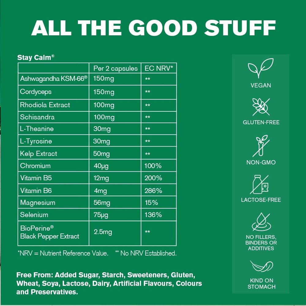 Including the powerful adaptogens Ashwagandha KSM-66®, Rhodiola, Schisandra, and Cordyceps, with the amino acids L-Theanine and L-Tyrosine, Stay Calm® manages stress, pressure and tension, providing natural balance, calm, focus and energy.