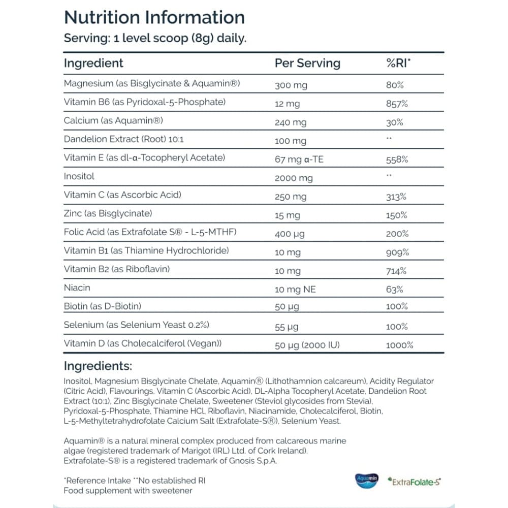 Inositol, Magnesium Bisglycinate Chelate, AquaminĀ® (Lithothamnion Calcareum), Flavourings, Acidity Regulator (Citric Acid), Ascorbic Acid, DL-Alpha Tocopheryl Acetate, Dandelion Root Extract (10:1), Zinc Bisglycinate Chelate, Sweetener (Steviol glycosides from Stevia), Pyridoxal-5-Phosphate, Thiamine HCL, Riboflavin, Niacinamide, Cholecalciferol, Biotin, L-Selenomethionine (SeLECTĀ®), L-5-Methyltetrahydrofolate Calcium Salt (Extrafolate-SĀ®).