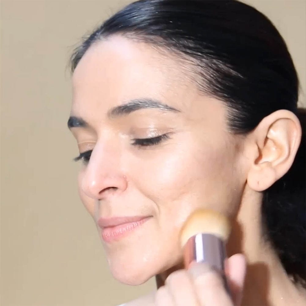 Use a make up brush to apply the tan, blending in evenly across the face.Ā