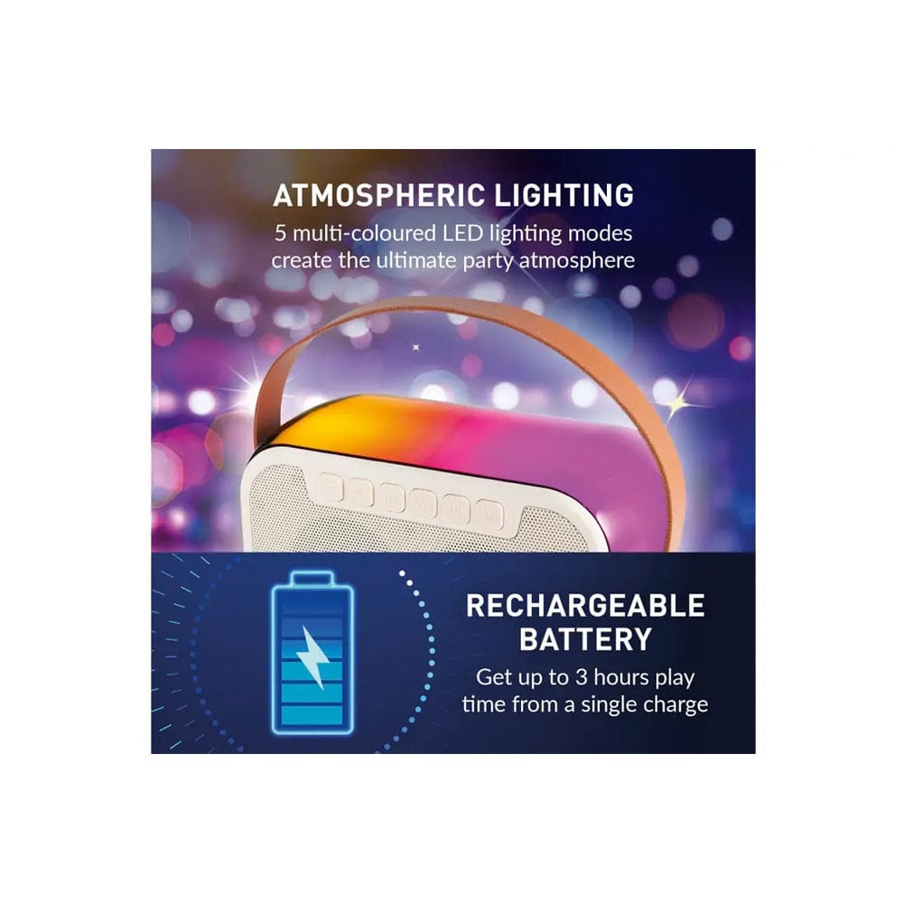 Sing the night away with this iTek I58086 cream portable karaoke Bluetooth party speaker. The 10W wireless rechargeable speaker delivers crisp, clear sound with deep bass. Connect to any Bluetooth device and stream tracks up to 10m away. Also includes slots for USB, AUX and TF card. Two wireless rechargeable microphones feature four funny voice effects and reverb for a fun duet with friends. Features 5 LED light modes to create the ultimate party atmosphere on the go.