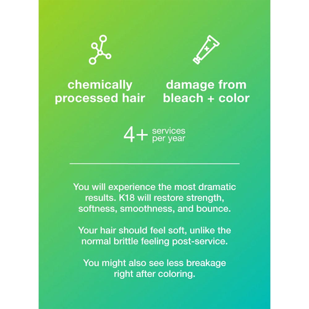 What makes K18 so different? Conditioners temporarily smooth the outer layer of the cuticle and bonds tend to patch the hair but wash out over time. K18 reconstructs the hair structure's interchains and intrachains and will not wash out over time, in fact hair will just keep getting stronger with each treatment.
