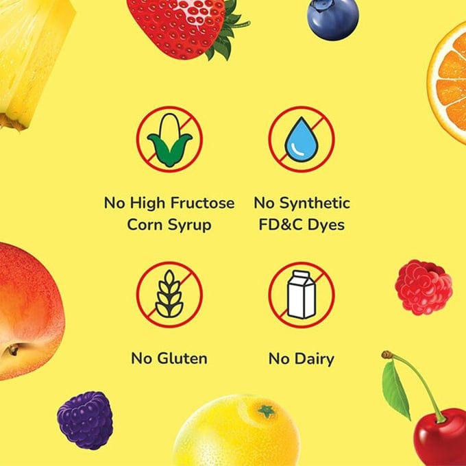 - Delicious cherry, strawberry, orange, pineapple, and blueberry flavors