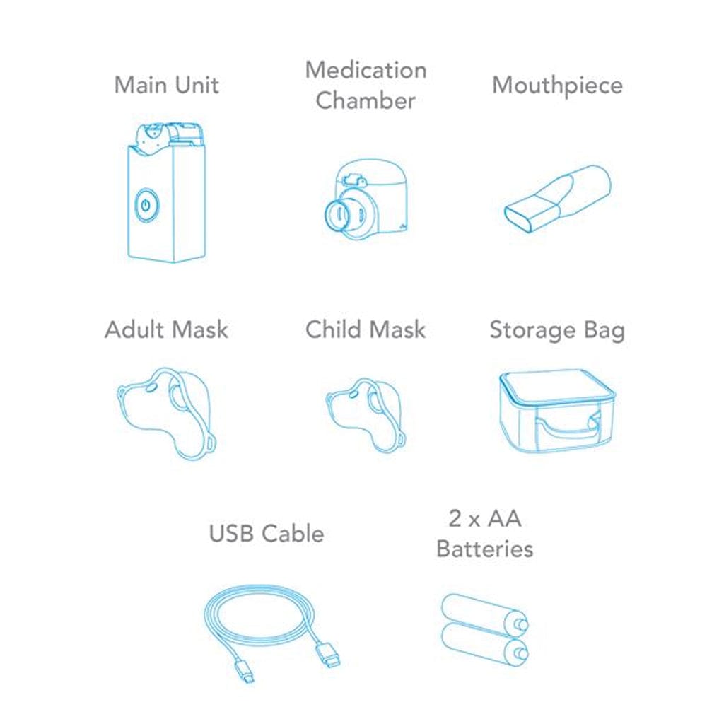Its compact size fits comfortably in the palm of your hand but is still powerful enough to effectively deliver needed medication for respiratory conditions like a simple cough, Asthma, COPD and Cystic Fibrosis. Its powerful vibrating mesh technology converts medication into a fine mist of only 1.51 microns with an ambient noise level of less than 35db.