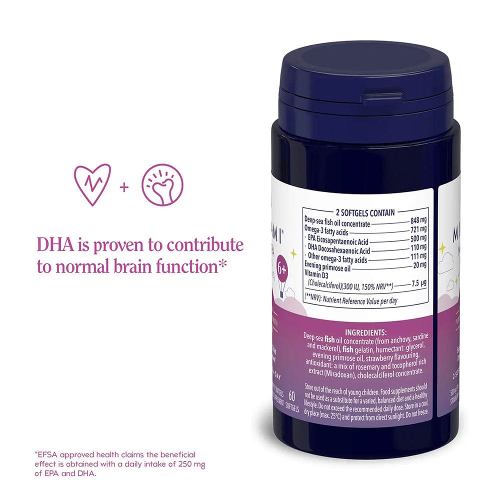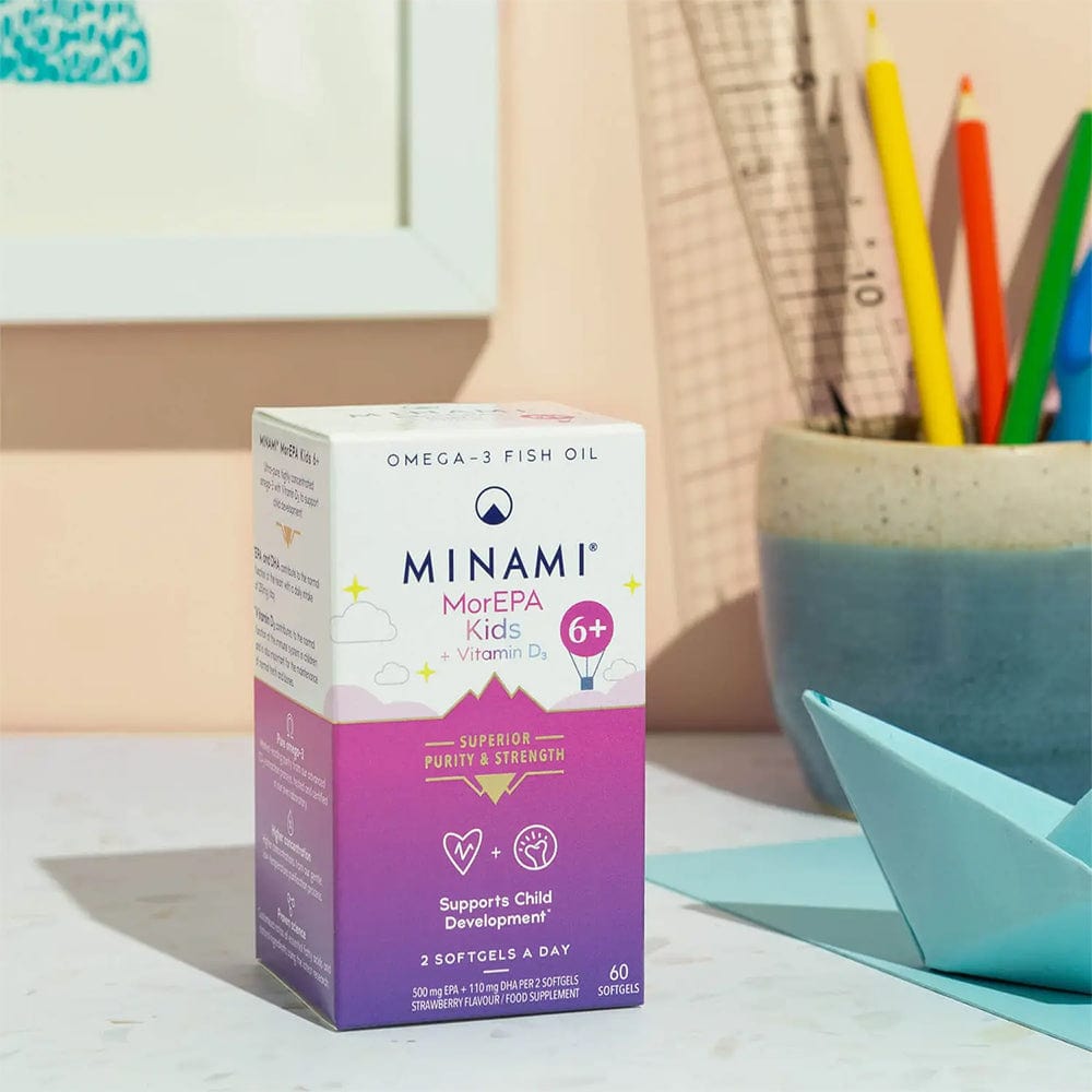 The Minami Morepa Mini Junior Softgels are designed for children aged 6+. This strawberry flavour supplement helps support: