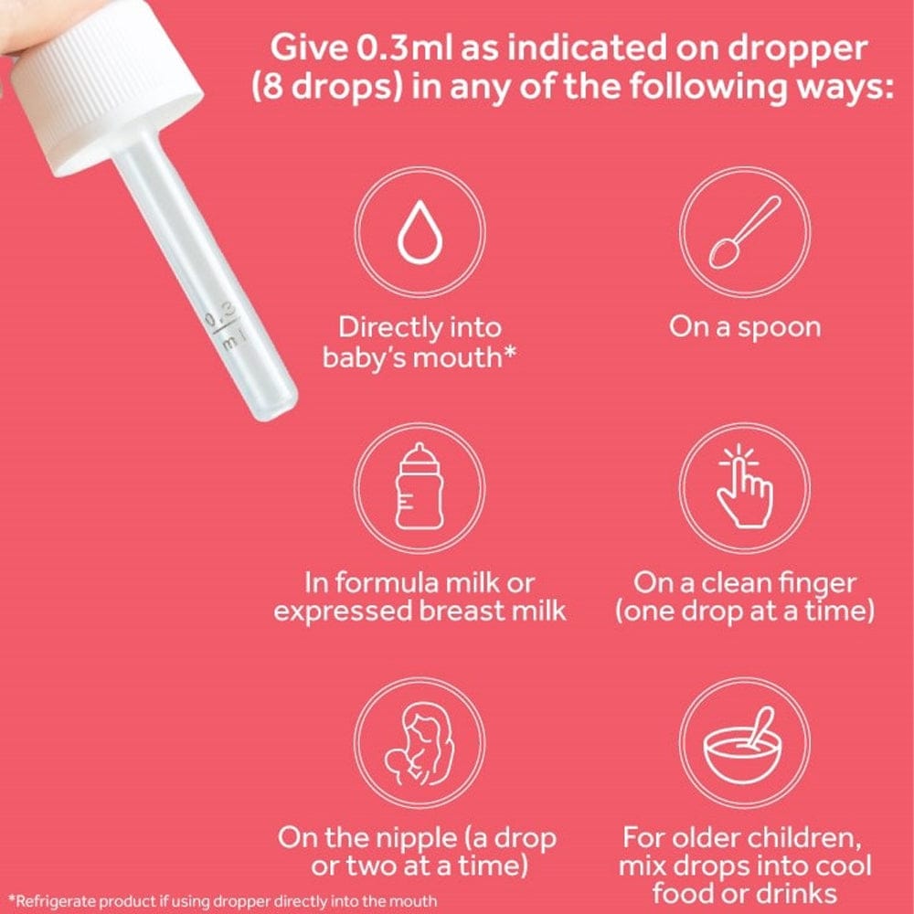 For best results give 0.3ml (8 drops) daily. 8 drops contain a minimum of 1 billion live Bifidobacterium breve M-16VĀ®. Do not exceed recommended daily dosage.