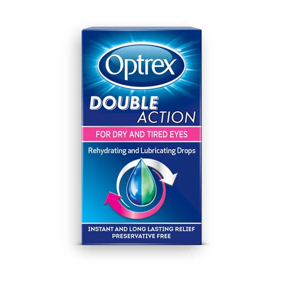 Optrex Double Action™ Rehydrating and Lubricating Drops works with your eyes to help restore their moisture. For dry and tired eyes. Instant and long lasting relief