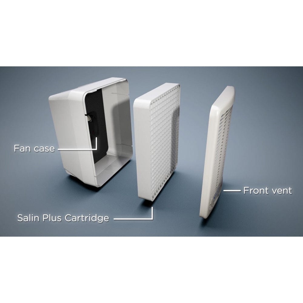 Salin Plus© Air Purifier, using a fan system, draws the air from the room into the back of the device and through a salt cartridge pushing the purified (ionized) air back into the room.