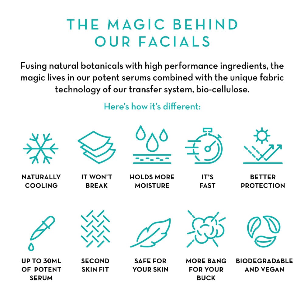 Harnessing the power of cryo-technology, the naturally cooling transfer system, made with game-changing biocellulose, fits the facial contours like a second skin. Cooling the skin to soothe, depuff, and promote blood and nutrient circulation, it drives the hydrating serum deeper into the skin.