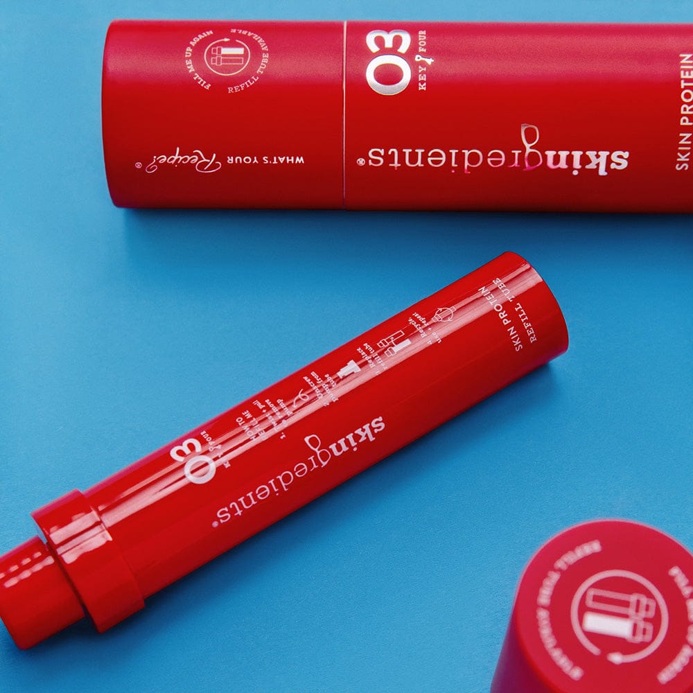 Skin Protein is the 03Ā® step in the Skingredients KeyFour regime. Use it in the AM + PM to tackle a line-up of skin concerns, including dullness, lines and wrinkles, lax skin, dark circles, blackheads, whiteheads, lumps, bumps, large pores and excessive oiliness. Vitamin A is a skincare hero to guarantee visible results. Itās progressive enough for daily use, yet effective so you can quickly achieve noticeable results. After falling in love with 03Ā® (aka the red one) and using every last pump, keep your primary pack and switch to buying a refill tube next time. This Primary Pack tube is your tube-for-life thatās made from resilient, ultra-durable materials.