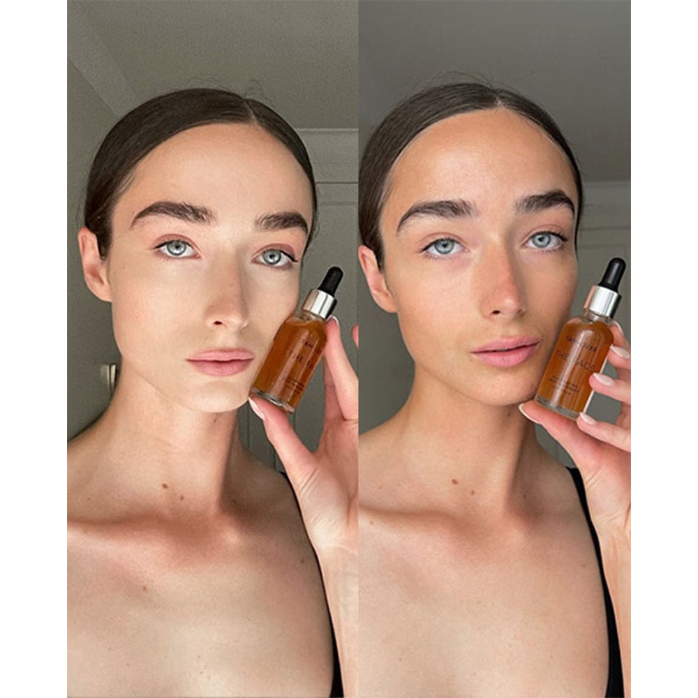 Mix 1-12 drops into your moisturiser, serum or oil in the palm of your hand, then apply evenly to the face. The more drops you apply, the deeper your glow will be. Wash hands thoroughly after application.